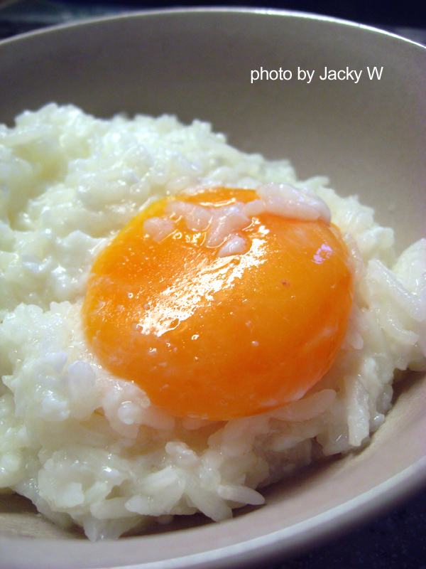 隔夜冷飯, 以水翻煮.轉中火, 下蛋於飯面上, 別動, leave it alone.待蛋白稍轉色, 以鐵匙輕輕與飯混合, 別碰蛋黃.直待蛋黃半生半熟, 熄火.上碟, 下幾滴生抽.