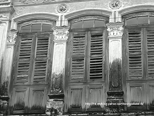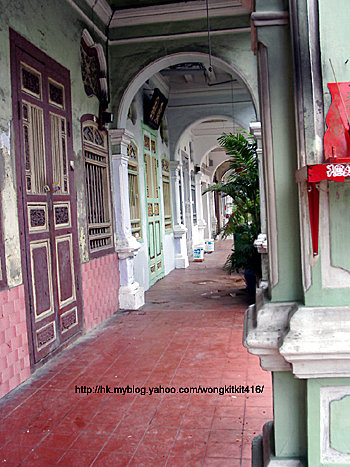看上去應該是建於戰前的華人民居,兩層高,屋頂鋪滿發黑瓦片,二樓還有木製的窗扉。騎樓的設計,配合炎熱多雨的天氣。一間接一間,每間門前的牆和柱塗上不同的顏色。保養良好的舊建築,實在討人喜愛。