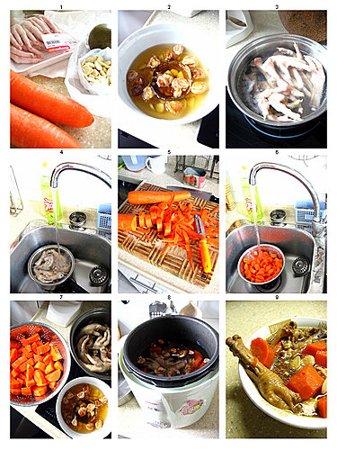 1. 湯料: 羅漢果 (6/個), 紅蘿蔔 (7.3), 雞腳 (12.5), 南杏 (5);