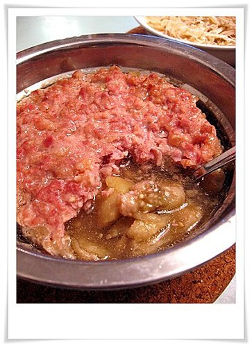 既然剛才隨口說了做肉餅,不如直把豬肉鋪在茄子上面好了。