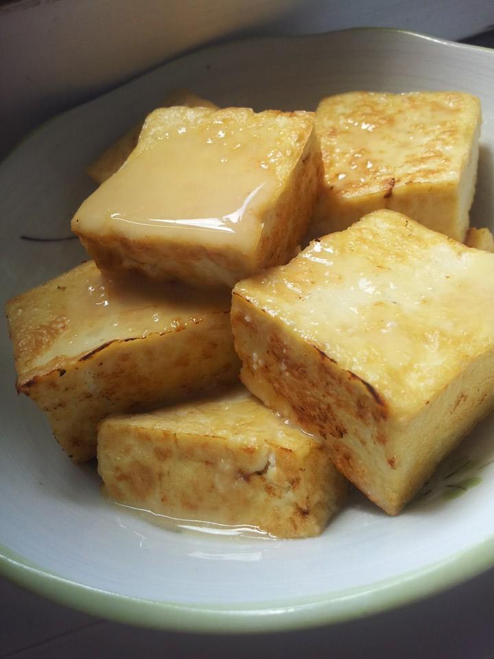 硬豆腐一磚,十刀成塊,乾煎四邊,味噌加水成汁灑上即成,是日午餐。