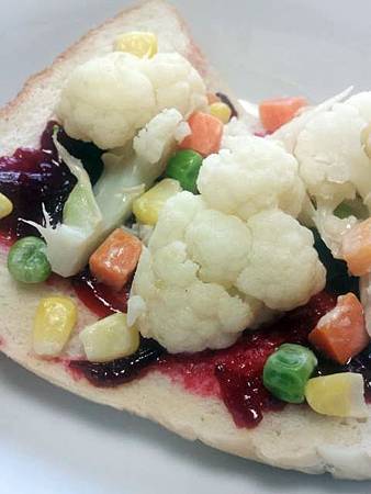塗手工洛神花醬, 上鋪花椰菜~