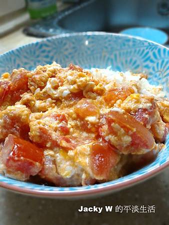 番茄切粒, 下油炒, 雞蛋不打均, 下鍋, 稍等, 待蛋白現出薄薄的一片白, 這時才起勁亂炒, 熄火即成.