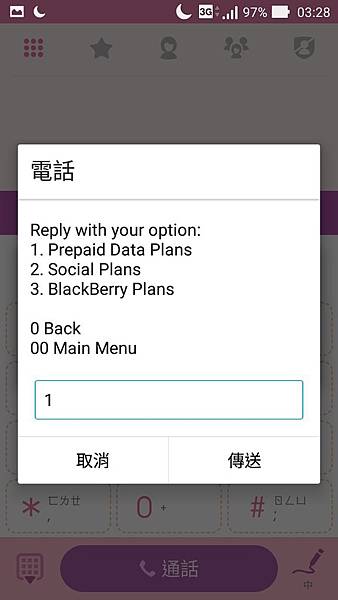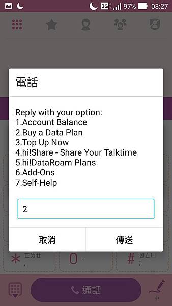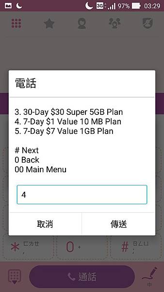 7. 買 10MB (7天), 按4; 買 1GB (7天), 按5, 傳送