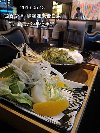 綠咖哩素薈白飯, 咖哩帶淡淡椰子味, 撥開綠意, 見橙紅, 啊, 是南瓜, 還有茄子等雜菜, 材料新鮮.