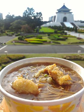 在著名的劉媽媽飯糰旁邊有間賣早午餐的家庭小店,餐單掛外面,中間鐵閘打開,裡面小灶頭,只售三角飯糰和麵線。早餐愛熱,捧著紙碗找地方開餐,找著找著來到一個大公園。