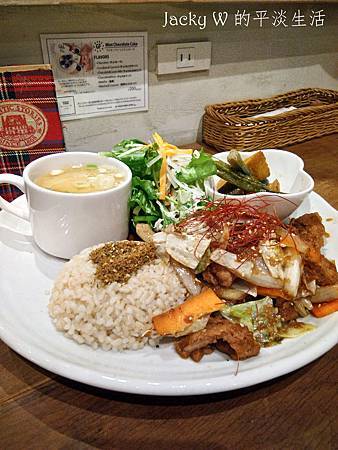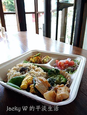 弁当食材已經頗精緻,主打有機糙米飯,好黏,像在吃糙米壽司(其他素食店煮得較乾)。