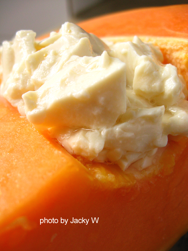 挖出果核,填入山水豆腐花,澆上有機三葉草蜜榶.
